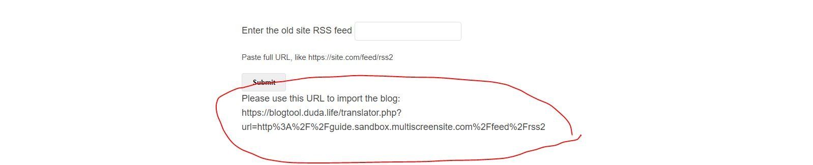 This is the first step, getting the RSS Link. To get the link you have to go to the blog settings and you should be able to see the RSS Link as in the image. Copy the link and then go to https://blogtool.duda.life/ and paste the link where it says "Enter the old site RSS feed" then click on the "Submit" button.